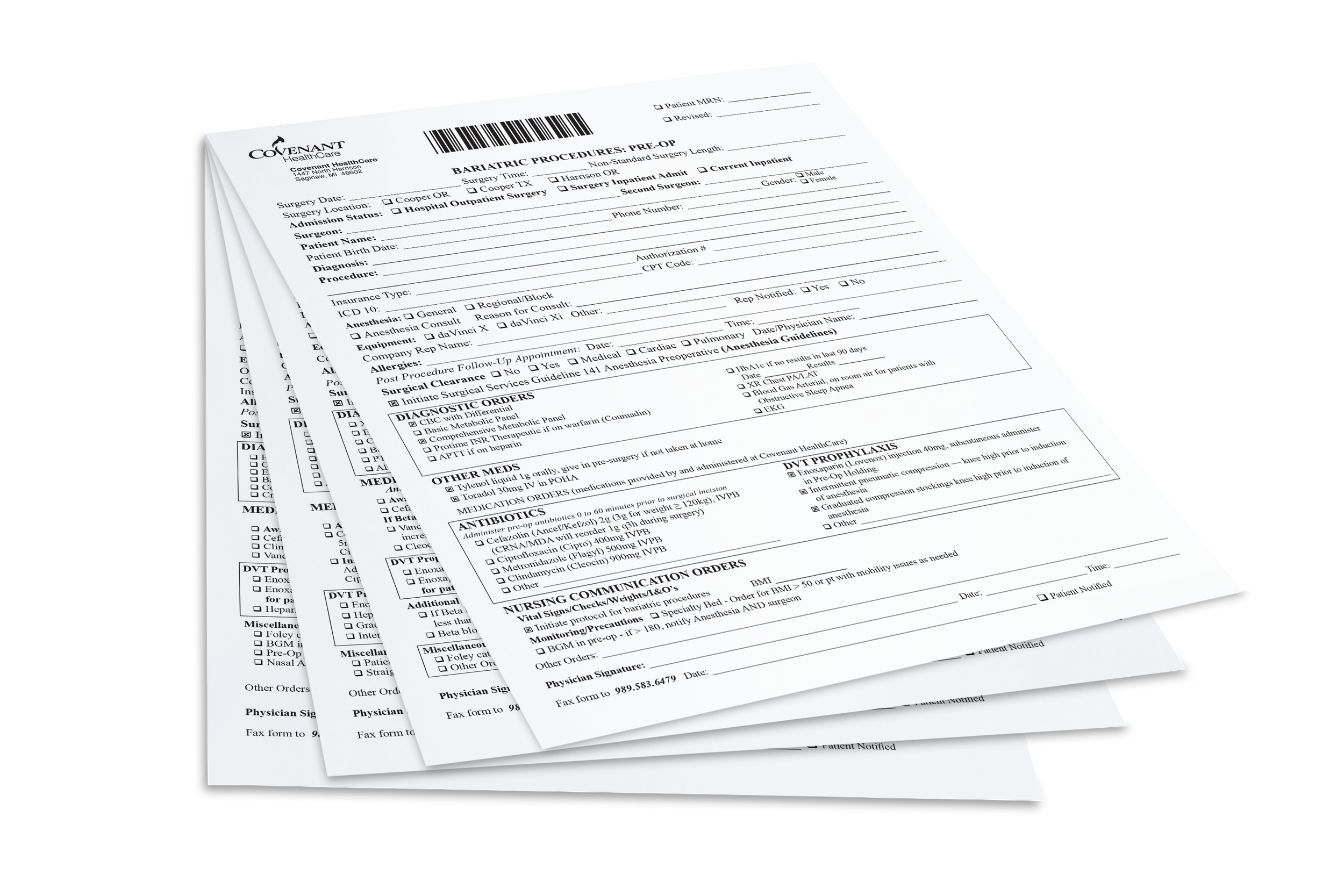 These surgery forms were created to help solve Covenant Healthcare’s problem of having too much irrelevant information on their pre-op procedure paperwork. With these documents, five pages of notes per procedure were condensed into one page each. The forms were also made into fillable PDF documents which could then be attached to each patient’s online medical chart for other providers to access.